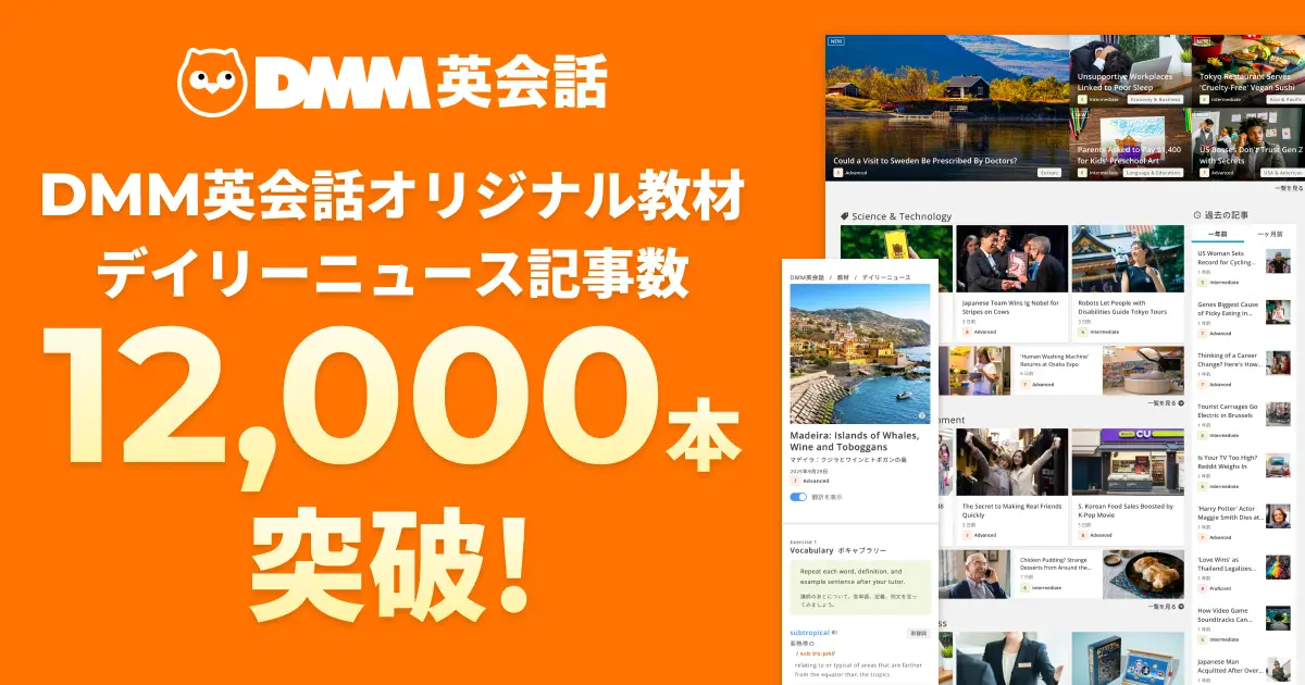DMM.com、「DMM英会話」オリジナル教材デイリーニュース記事数が1万2000本を突破