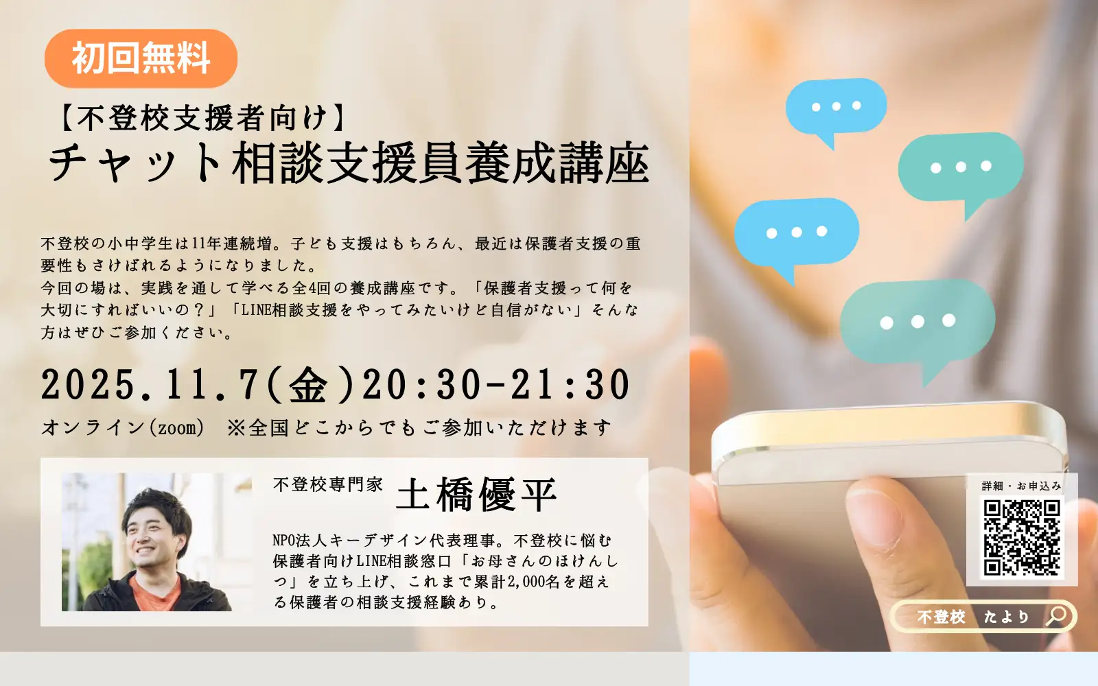 同講座は、オンラインで全4回実施し、初回講座は無料で参加できる。不登校支援に興味がある人や、チャット相談のスキルを身に付けたい人が対象で、実践的な内容を学ぶ。