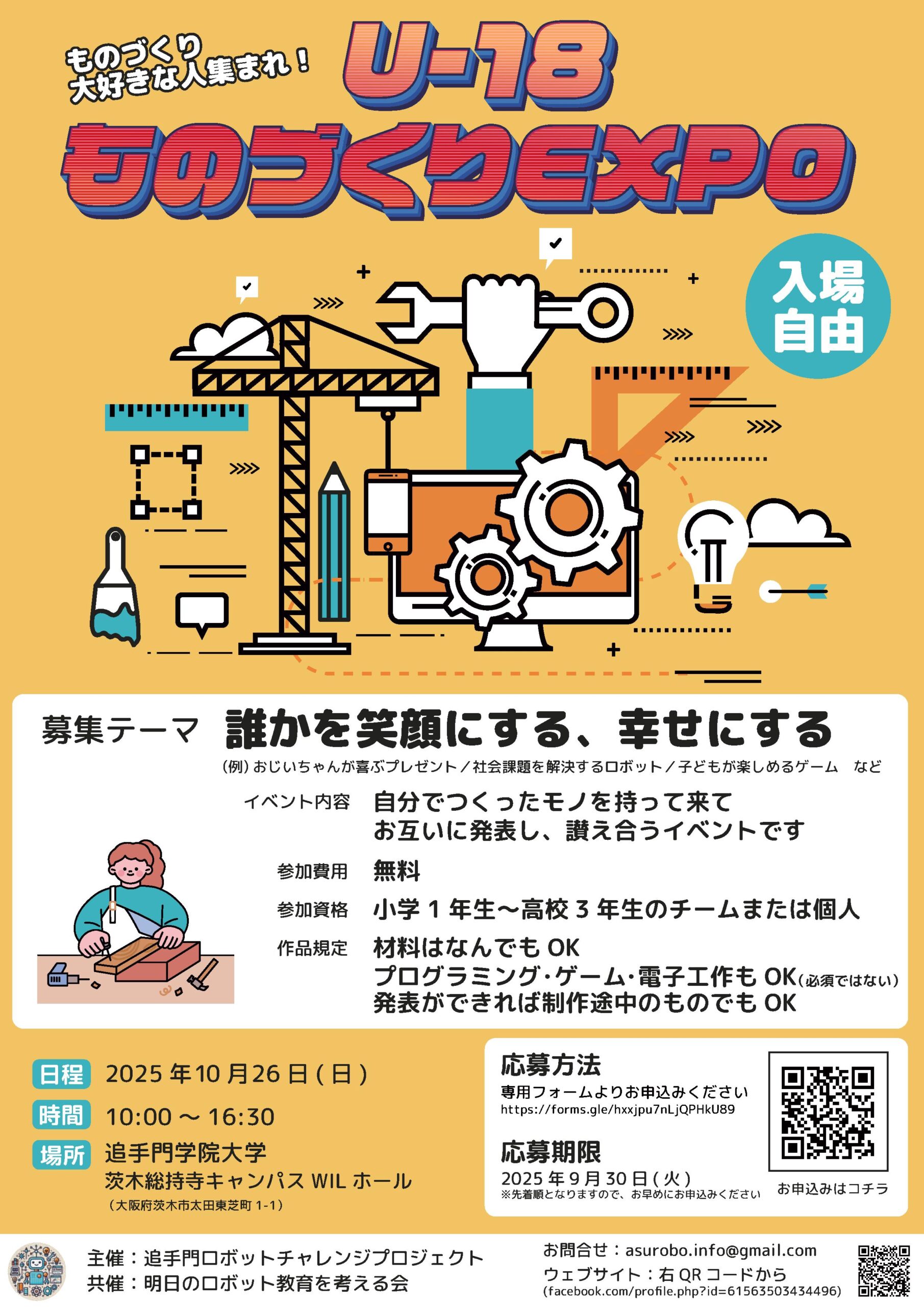 追手門学院大学は、 関西圏でものづくりに取り組む小中高生が集まり、自ら作り上げた作品を発表し合うイベント「U-18ものづくりEXPO 2025」を10月26日に開催する。