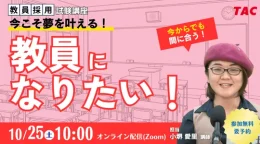 TACは、教員採用試験向けのオンラインセミナー「今こそ夢を叶える。教員になりたい!」を、10月25日に無料開催する。