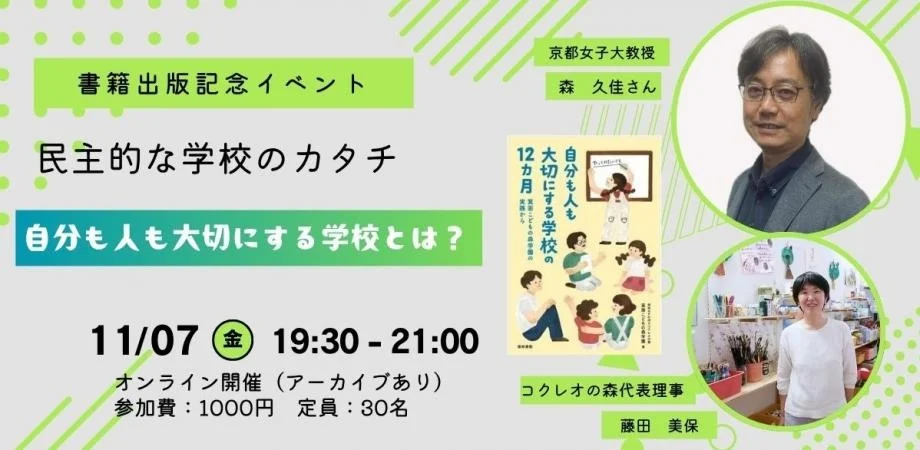 箕面こどもの森学園を運営するコクレオの森は、書籍『自分も人も大切にする学校の12か月』出版記念イベントを11月7日にオンラインで開催する。