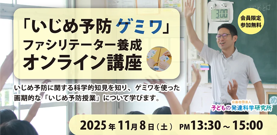 子どもの発達科学研究所は、「いじめ予防ゲミワ」ファシリテーター養成 オンライン講座を11月8日に開催する。