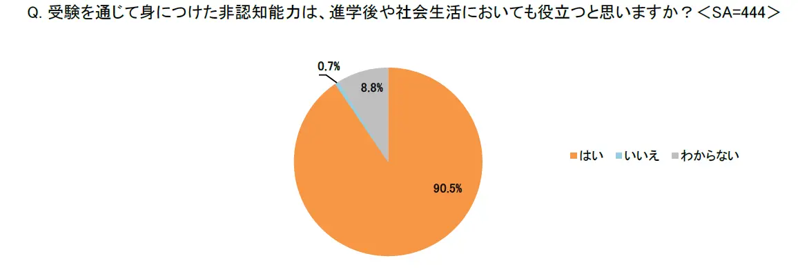 また、「受験を通じて身につけた非認知能力は、進学後や社会生活でも役に立つと思うか?」との質問には、90.5%が「はい」と回答しており、非認知能力が受験期での一時的な力ではなく、進学後や社会生活でも子どもの成長を支える根幹的な力として、かなり高く評価されていることが明らかになった。