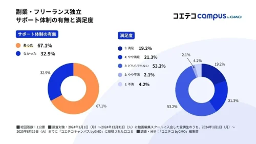 GMOインターネットグループであるGMOメディアは21日、プログラミング・Webマーケティングスクール検索サイト「コエテコキャンパス byGMO」が、2024年に動画編集スクールへ入会した受講者112名を対象に実施した満足度や学習環境に関する調査結果を発表した。
