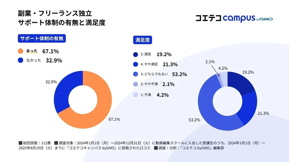 それによると、動画編集スクールの卒業後の主なビジョンである「副業」や「フリーランス独立」に関するサポート体制の有無を尋ねたところ、67.1%が「あった」と回答。