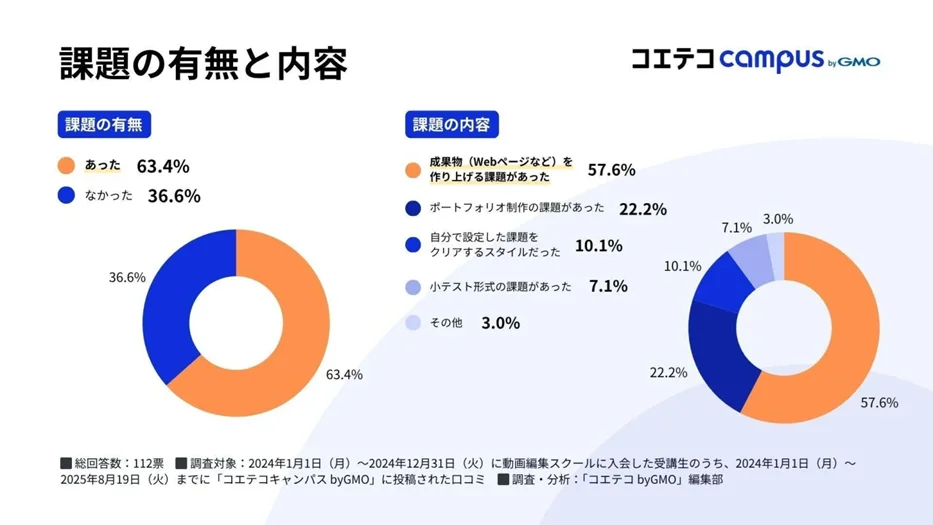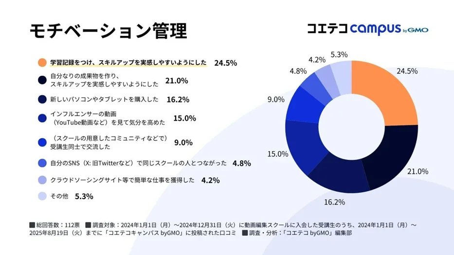 GMOインターネットグループであるGMOメディアは21日、プログラミング・Webマーケティングスクール検索サイト「コエテコキャンパス byGMO」が、2024年に動画編集スクールへ入会した受講者112名を対象に実施した満足度や学習環境に関する調査結果を発表した。