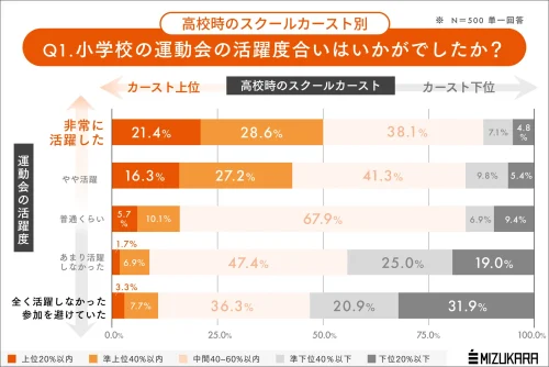 ミズカラは22日、全国の25~59歳の働く男女500人を対象に実施した、「運動会の活躍度合いと現在のエフィカシーの相関」に関する意識・実態調査の結果をまとめ発表した。