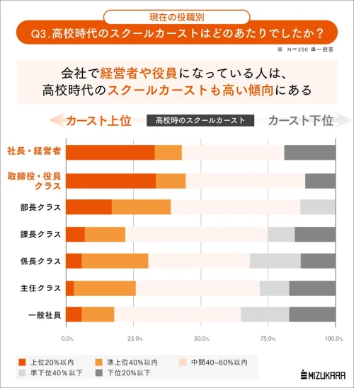 では、高校時代に「イケてる集団」に属していた=高エフィカシー層は、その後社会に出たら実際に活躍するのだろうか?—そこで、現在の会社における役職の相関を分析したところ、会社で経営者や役員になっている人は、高校時代のスクールカーストも高く「高校のスクールカーストが実社会の縮図」になっているともいえそうだ。