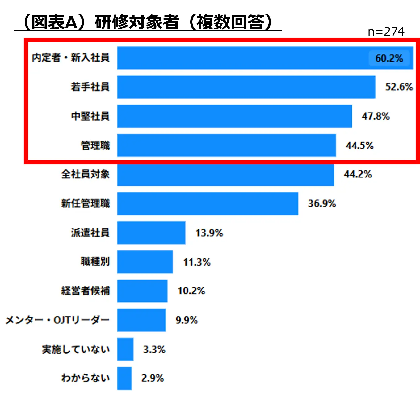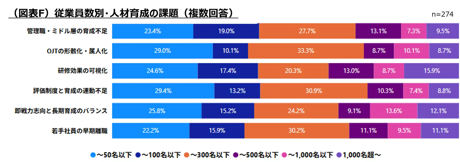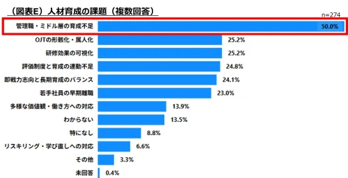 全体の50.0%が「管理職・ミドル層の育成不足」を課題と回答。研修対象者の上位に「管理職」や「新任管理職」が挙げられたものの、さらに育成が必要と考えられている。特に従業員300名以下の企業では、70.1%が課題意識を持っている。