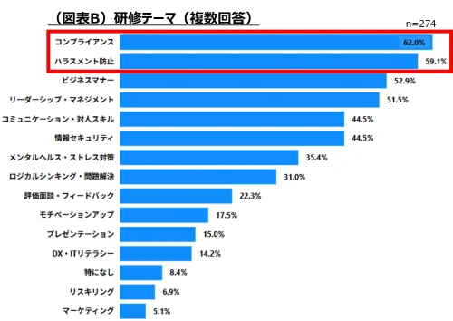 実施テーマの上位は「コンプライアンス」(62.0%)、「ハラスメント防止」(59.1%)、「ビジネスマナー」(52.9%)、「リーダーシップ・マネジメント」(51.5%)となった。近年の企業不祥事やコンプライアンス意識の高まりを受け、自社を守る教育への注力がうかがえる。
