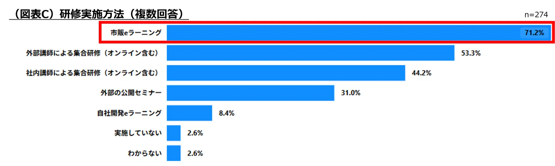 研修方法は「市販のeラーニング」(71.2%)の利用が最多で、「自社開発eラーニング」は8.4%と少数だった。