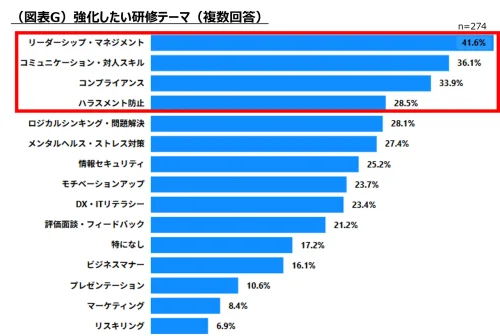 今後強化したい研修テーマとして、「リーダーシップ・マネジメント」(41.6%)、「コミュニケーション・対人スキル」(36.1%)、「コンプライアンス」(33.9%)が上位となり、管理職・ミドル層育成不足の課題との関連が示されている。