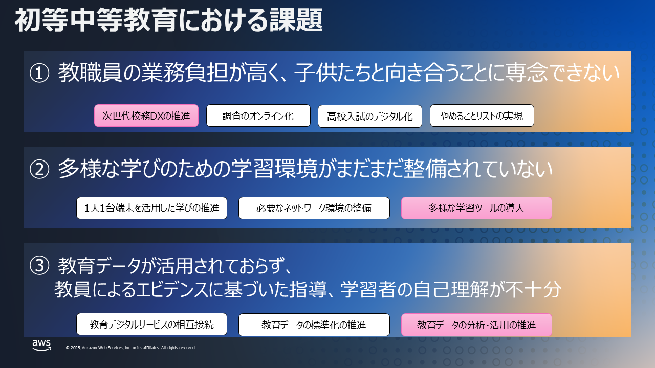 二つ目は、多様なEdTechサービスの提供。教育DXの実現には、EdTechサービスの活用が不可欠。AWSでは多様な学びのための学習環境整備、また、教職員の負荷軽減などに対応したEdTechサービスを教育委員会、提案・構築事業者へ積極的にエンゲージメントする。