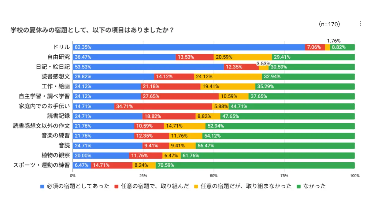 夏休みの宿題の定番といえば「自由研究」と「読書感想文」というイメージがあるが、「自由研究」は宿題としてあったと回答したのは7割で、必須だったのはその約半分という結果だった。「読書感想文」も宿題として出されたという回答は67%で全体では4位だったが、実際に取り組んだという回答は43%で、取り組んだ宿題の中では8位という結果になった。