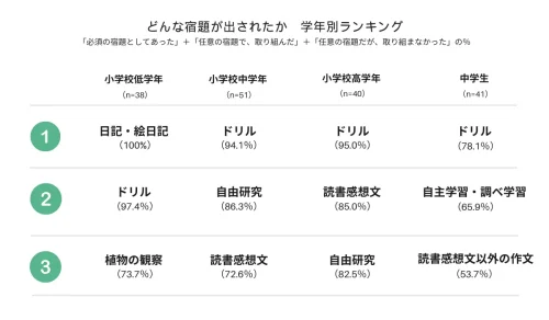 学年別にみると、小学校低学年では「日記・絵日記」が100%で、回答した38人全員がこの宿題があったという結果になった。また、小学校中学年以上との違いとして、「植物の観察」が3位と上位に入った。中学年~高学年では「自由研究」「読書感想文」が上位に入っているが、中学生以上になると「自主学習・調べ学習」が2位で、より「学習」に特化した宿題に変化している。