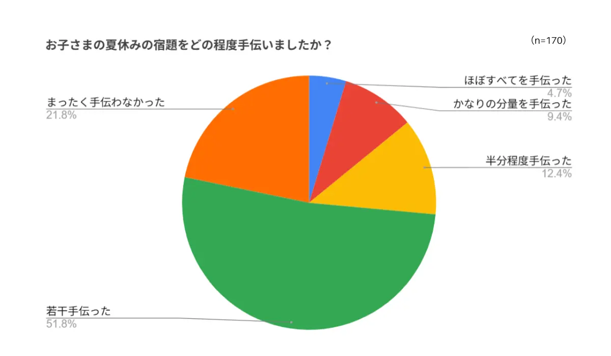 そこで、「子どもの夏休みの宿題をどの程度手伝ったか」と尋ねたところ、約8割(78.2%)が「何らかの形で宿題を手伝った」と回答。「半分以上手伝った」という保護者も26.5%と少なくなかった。