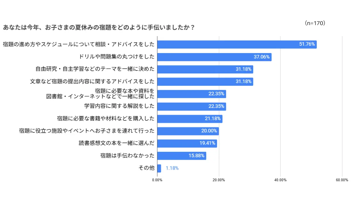 では、具体的にどのようなことをサポートしたのか?「子どもの夏休みの宿題をどのように手伝ったか」と聞いたところ、最も多かったのは「宿題の進め方やスケジュールについて相談・アドバイスした」というもので、半分以上の保護者が回答。どの宿題をいつまでにやるか、時間がかかる宿題はどうやって進めるか、といった、子どもにはなかなか難しい進捗管理の部分を手伝った保護者が多かった。また、出された宿題として最も多かった「ドリル」も保護者への影響が大きいようで、「ドリルや問題集の丸つけをした」という保護者が37%に上った。