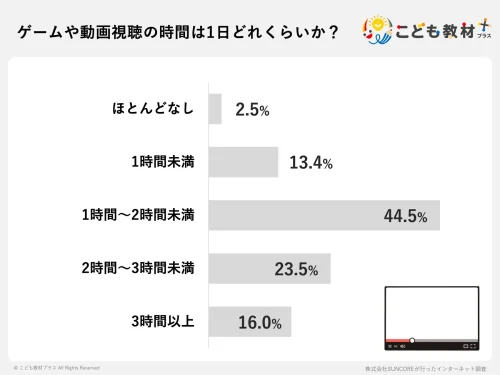 この懸念を裏付けるように、「ゲームや動画視聴(YouTube、テレビ含む)に費やす時間」では、「1時間~2時間未満」が44.5%と最多、次いで「2時間~3時間未満」23.5%、「3時間以上」16.0%となった。合計すると、1日に1時間以上ゲームや動画を視聴する予定の小学生が84.0%に達しており、多くの家庭でデジタルデバイスとの付き合い方が課題となっている実態が浮かび上がった。