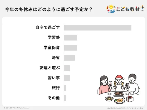 「今年の冬休み、お子様はどのように過ごす予定ですか?」の問いでは、「自宅で過ごす」が55.8%。次いで「学習塾」10.8%、「学童保育」10.8%となった。