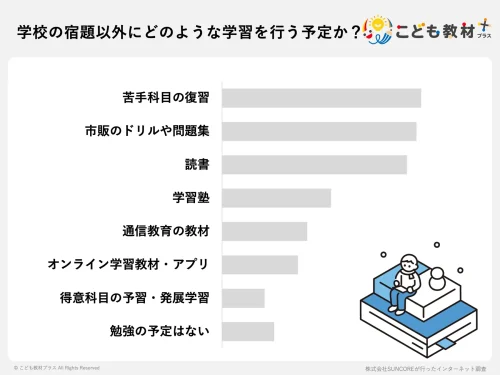 「学校の宿題以外に、どのような学習を行う予定ですか?(複数回答)」の問いでは、「苦手科目の復習」と「市販のドリルや問題集」がほぼ同数でトップ。次いで「読書」が続き、家庭学習で堅実に弱点を補強しようとする傾向が見られた。 一方で、「学習塾」「通信教育の教材」の回答もあった。