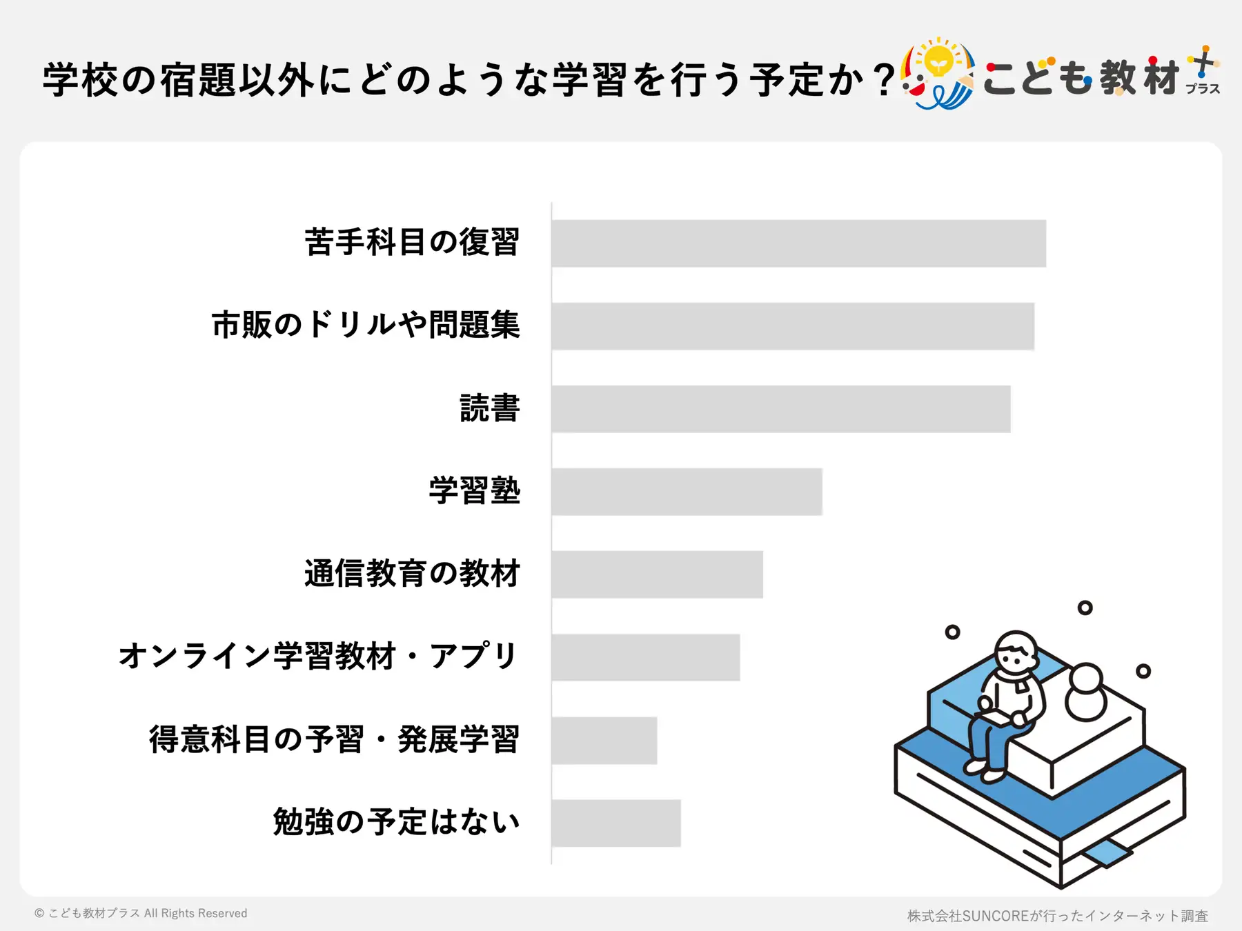「学校の宿題以外に、どのような学習を行う予定ですか?(複数回答)」の問いでは、「苦手科目の復習」と「市販のドリルや問題集」がほぼ同数でトップ。次いで「読書」が続き、家庭学習で堅実に弱点を補強しようとする傾向が見られた。 一方で、「学習塾」「通信教育の教材」の回答もあった。