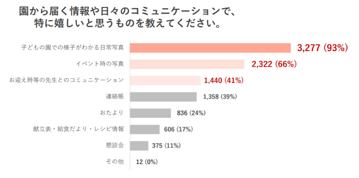 「園から届く情報や日々のコミュニケーションで特に嬉しいと思うもの」は、「子どもの園での様子がわかる日常写真」(93%)、次いで「イベント時の写真」(66%)で、多くの保護者が、子どもが園で過ごしている日常の様子を知りたいと願っている。