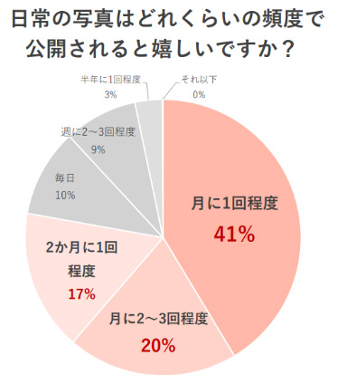 子どもの日常写真について好ましい公開頻度については、「月に1回程度」(41%)が最多。続いて「月に2~3回程度」(20%)、「2カ月に1回程度」(17%)。