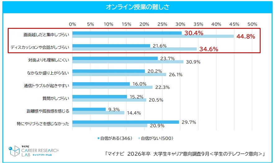 さらに、「オンライン授業の難しさ」について聞いたところ、自信の有無に関わらず「集中のしづらさ」が最も多くあげられた。加えて、自信がない学生は「ディスカッションや会話がしづらい(34.6%)」といったコミュニケーション面での困難が上位にあがった。