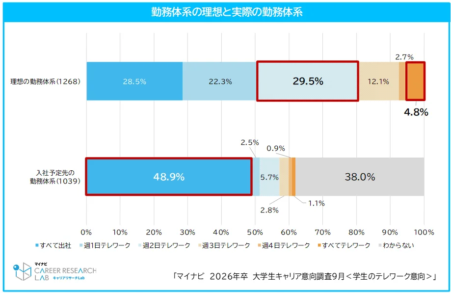 学生に「理想的なテレワーク日数」について聞いたところ、最多は「週2日テレワーク(29.5%)」で、次いで「すべて出社(28.5%)」だった。