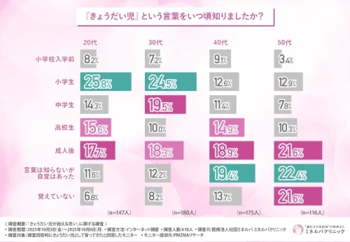 「きょうだい児」という言葉を知った時期では、年代が上がるほどこの言葉を知る機会が少なかった傾向が見られ、これは、社会的な認知や啓発が比較的近年になって広まったことが一因と考えられる。