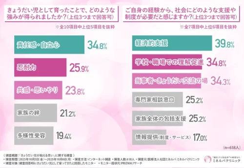 きょうだい児として育ったことでどのような強みが得られたかを訊ねたところ、「責任感・自立心」「忍耐力」「共感・思いやり」が上位を占めた。また、このような経験から社会にどのような支援や制度が必要だと感じるかを訊ねたところ、「経済的支援」「学校・職場での理解促進」「当事者・きょうだい交流の場」が上位となった。