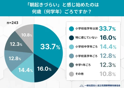 「朝起きづらい」と感じ始めたのは何歳(何学年)ごろか?と尋ねたところ、「小学校低学年以前」33.7%、「特に感じていない」16.0%、「小学校中学年ごろ」14.4%、「小学校高学年ごろ」12.8%、「中学1年ごろ」12.3%という結果になった。