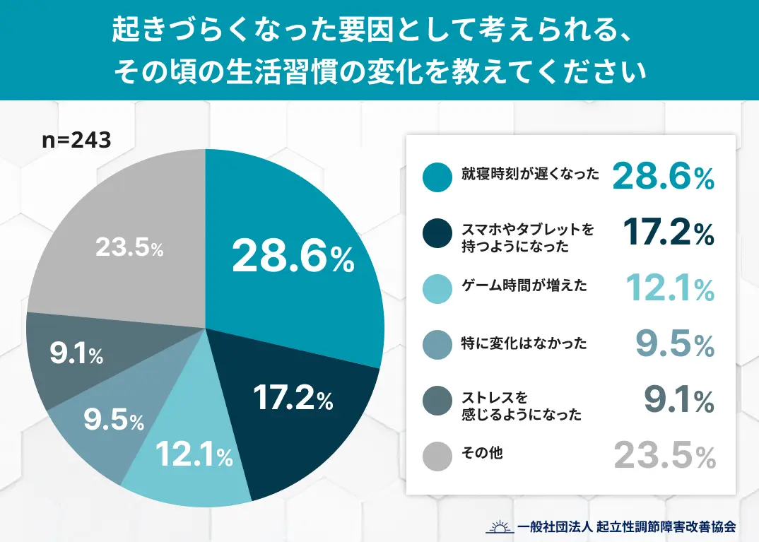 起きづらくなった要因として考えられる、その頃の生活習慣の変化を尋ねたところ、「就寝時刻が遅くなった」28.6%、「スマホやタブレットを持つようになった」17.2%、「ゲーム時間が増えた」12.1%、「特に変化はなかった」9.5%、「ストレスを感じるようになった(勉強・友人関係など)」9.1%、「その他」23.5%(習い事が増えた:7.6%、部活動を始めた:6.6%、学習塾に通い始めた:5.9%など)という結果になった。