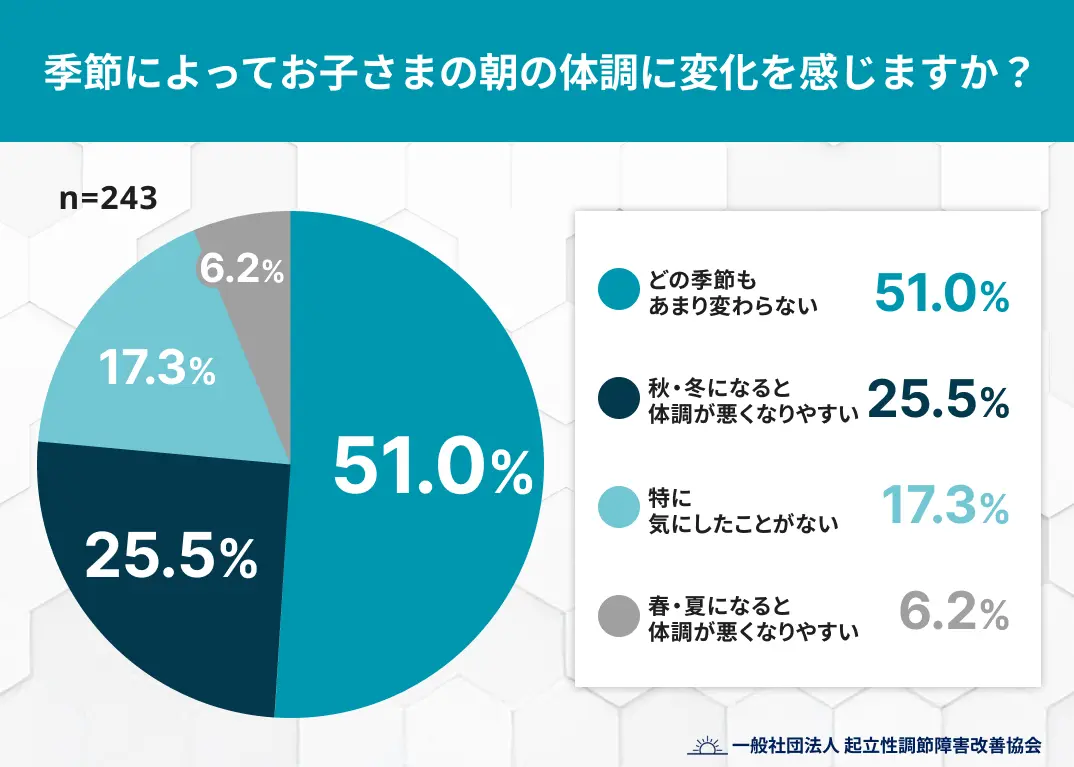 「季節によって子どもの朝の体調に変化を感じるか?」と聞いたところ、「どの季節もあまり変わらない」51.0%、「秋・冬になると体調が悪くなりやすい」25.5%、「特に気にしたことがない」17.3%、「春・夏になると体調が悪くなりやすい」6.2%という結果だった。