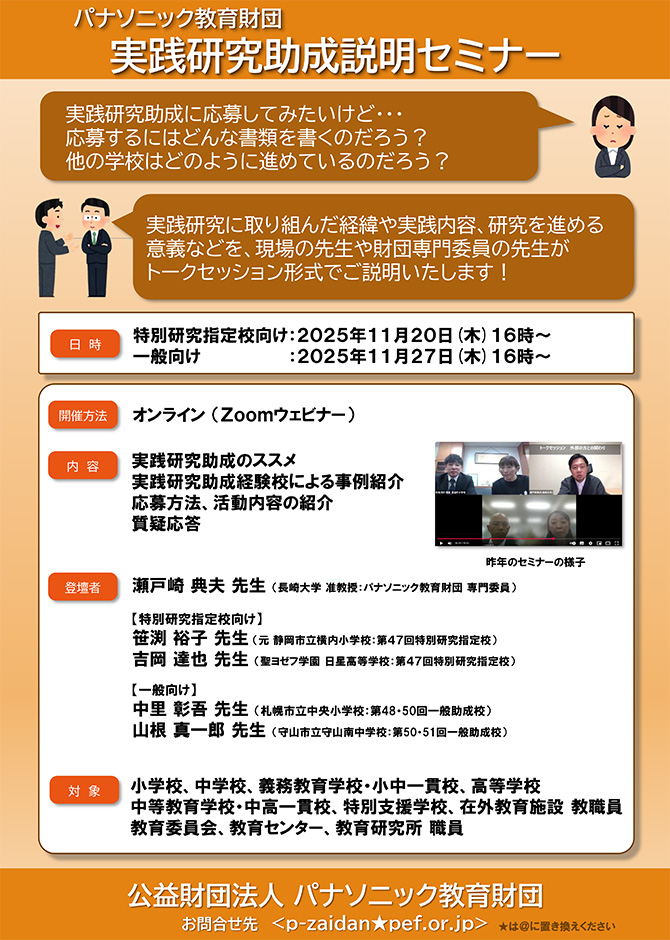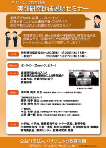 パナソニック教育財団は、「2026年度(第52回)実践研究助成説明セミナー」を、11月20日と27日に開催する。