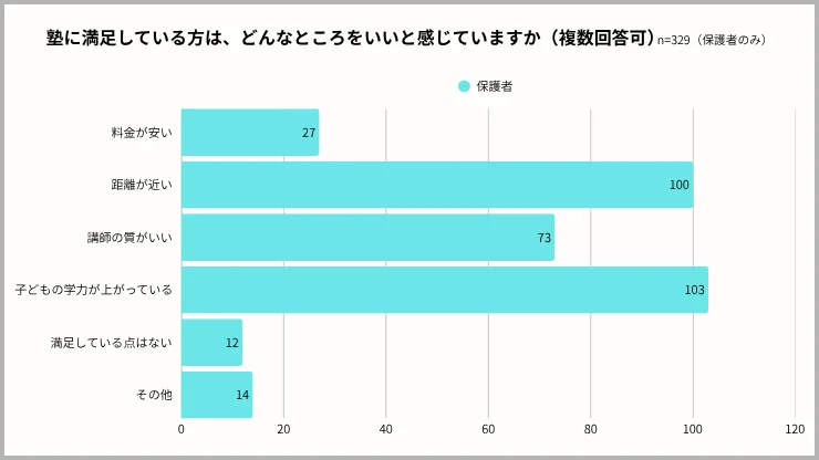 また、保護者に「塾の良かったところ」を尋ねたところ、最も多かったのは「子どもの学力が上がっている」(103人)で、以下、「距離が近い」(100人)、「講師の質がいい」(73人)、「料金が安い」(27人)などが続いた。