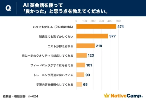 約8割がAI英会話を利用したことがあると回答した。AI英会話の利点は「24時間使える」「間違えても恥ずかしくない」こと、その一方で、「会話がワンパターンで飽きやすい」「実際の会話っぽさに欠ける」「人とのつながりがないのでモチベーションにつながりにくい」などの声も聞かれた。