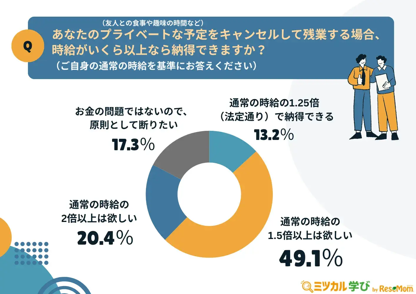 プライベートな予定をキャンセルして残業する場合、時給がいくら以上なら納得できるかを訊ねたところ、「通常の時給の1.5倍以上」または「2倍以上」と回答した人が約7割を占めた。「お金の問題ではないので原則として断りたい」との意見も全体の2割近くに上った。