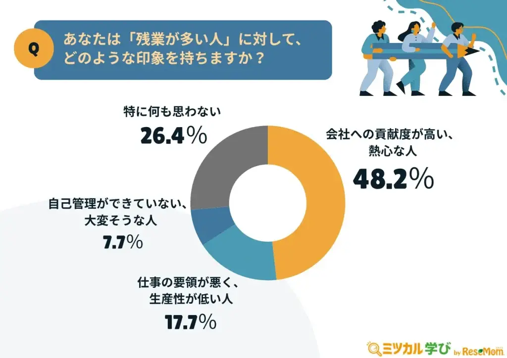 残業が多い人に対する印象を質問したところ、「会社への貢献度が高い、熱心な人」と肯定的な見方をしている人が半数近くを占めた一方、「仕事の要領が悪く、生産性が低い人」「自己管理ができていない、大変そうな人」といった否定的な見方をする人も約4分の1に上った。
