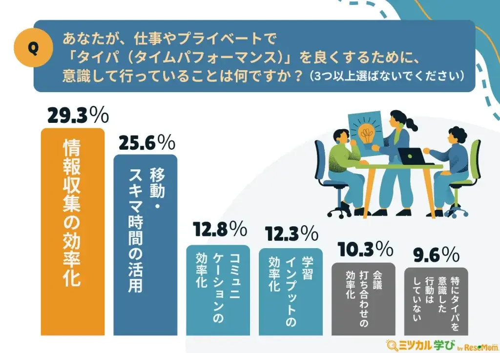 仕事やプライベートでタイムパフォーマンスを良くするために意識して行っていることは「情報収集の効率化」29.3%が最も多く、次いで「移動・スキマ時間の活用」が続いた。