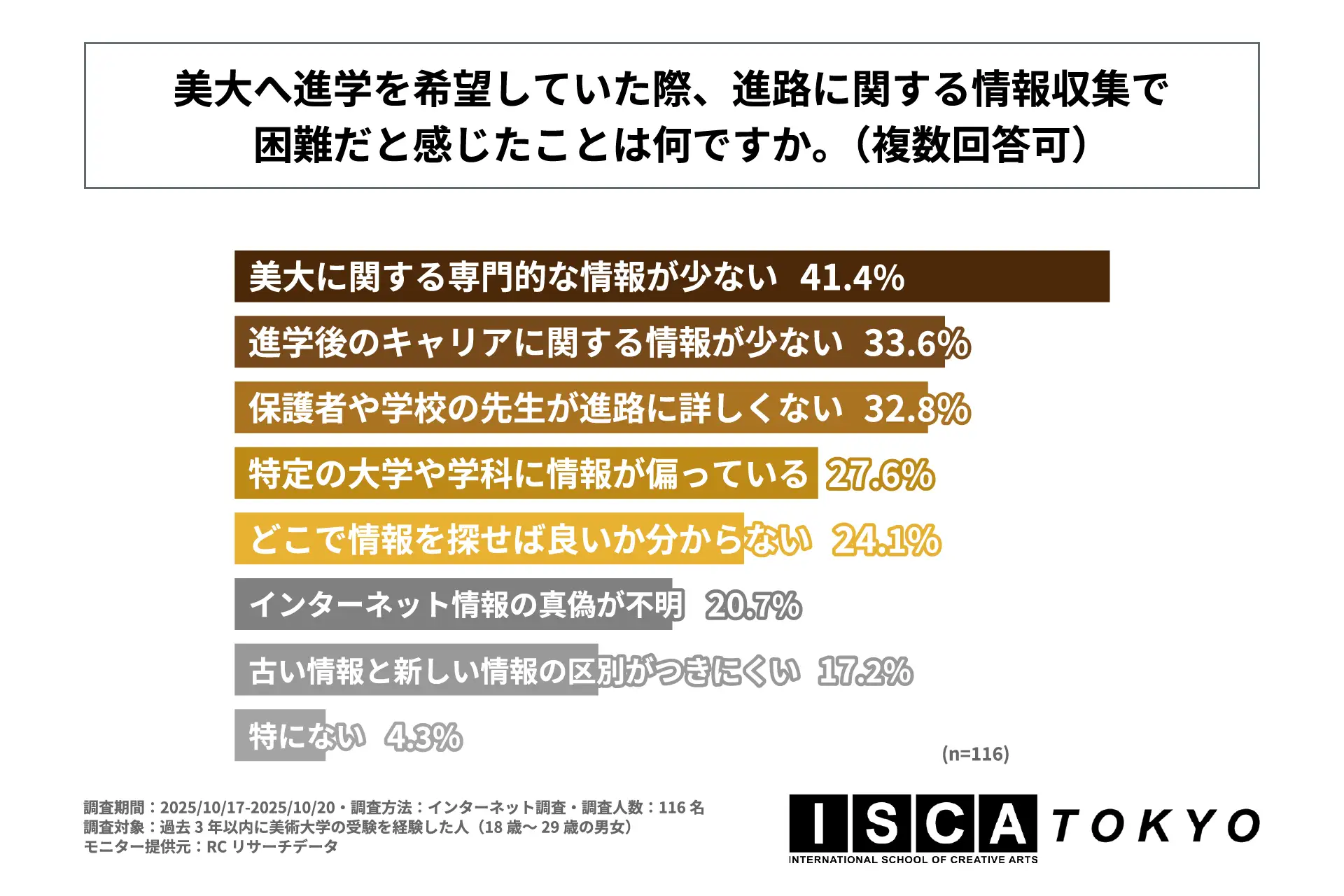 美大への進学を希望していた際、進路に関する情報収集で困難だと感じたことは、1位「美大に関する専門的な情報が少ないこと」2位「進学後のキャリアに関する情報が少ないこと」3位「保護者や学校の先生が進路に詳しくないこと」だった。