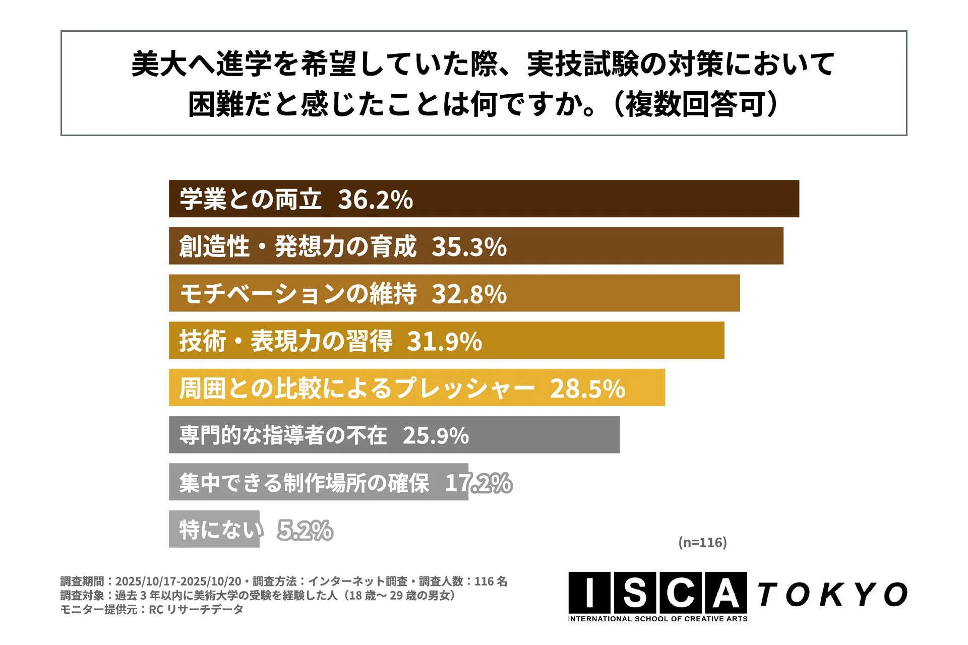 調査は過去3年以内に美術大学の受験を経験した18歳~29歳の男女を対象に10月17日~20日に行われ、116名から回答を得た。回答者の6割以上は美大の受験のために予備校に通っていた。