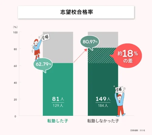 今回の調査で最も注目すべきは、志望校の合格率。「転塾しなかった子」の合格率が80.97%(184人中149人)であったのに対し、「転塾した子」の合格率は62.79%(129人中81人)と、約18%の差が見られた。