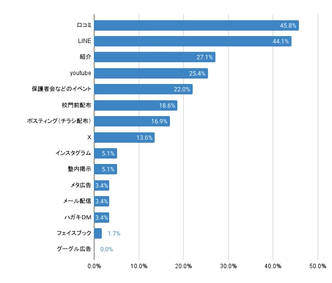 現在注力している施策については、「ポスティング」が最多の57.6%、次いで「紹介」が47.5%、「校門前配布」が44.1%。また、「LINE」が40.7%となり、保護者や見込顧客との接点強化に活用されている様子。
