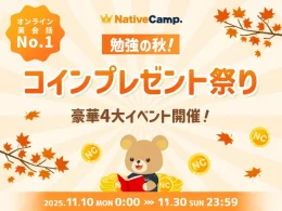 ネイティブキャンプは10日、学びの秋を応援するキャンペーン「勉強の秋!コインプレゼント祭り」を開始した。実施期間は11月30日23:59まで。