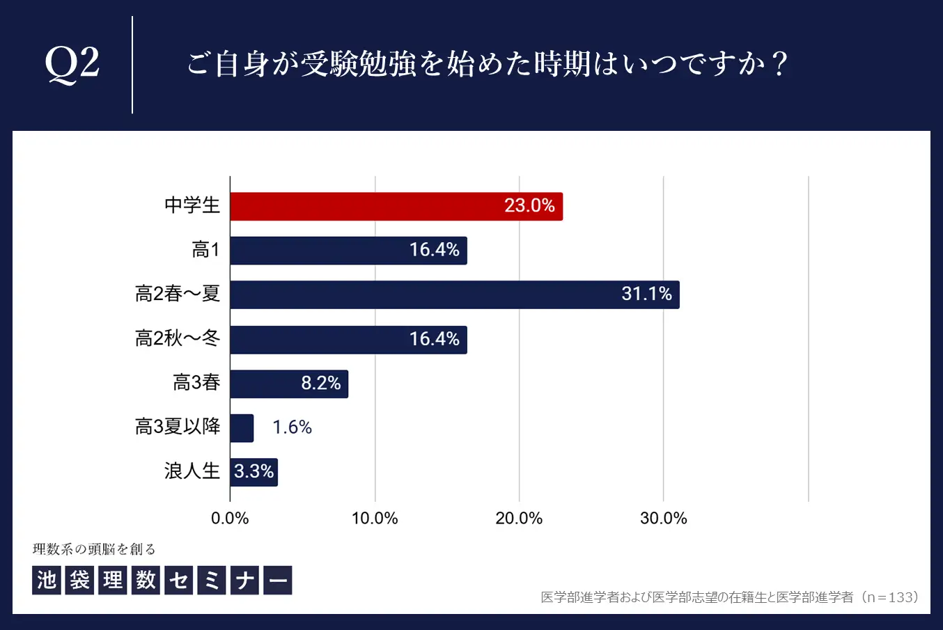 調査は、2022年10月18日~2025年4月13日の卒業生、および2025年4月8日~8月12日の在籍生の合計133名を対象に行われた。それによると、約5割が「高1から始めるのが理想」と回答した一方で、実際には約3割が「高2春~夏」に開始していることが明らかとなった。この結果から、医学部受験における「早期スタートの重要性は理解しているが、実行には至らない」受験生の実情が浮き彫りとなった。