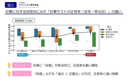 算数・数学のテストや計算テストにおいて、主観的な「自信」がテストの点数と相関があることは知られているが、では、この主観的な「自信」と、客観的なテスト序盤の「解答速度」や「正答速度」では、どちらがテストの正答率とより強く相関しているのか? これを比較検討するため、計算への自信と、テスト全体の正答率および単元別の正答率の関係を調べた。