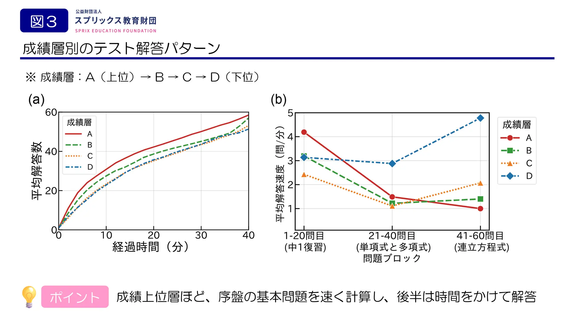 では、解答ペースの違いは、単元ごとでどう変化するのか?「成績層A」は、序盤の解答速度が最も速く、中盤から終盤にかけては着実にペースを落としていたが、これは簡単な問題で時間を確保し、難しい問題に時間をかける効率的なペース配分ができていることを示している。
