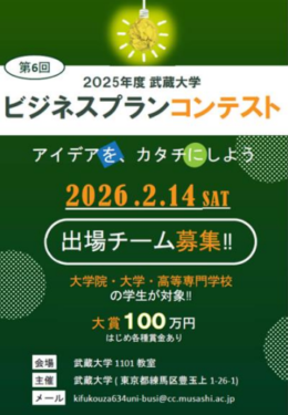 武蔵大学は、学生対象「第6回ビジネスプランコンテスト」を2026年2月14日に開催する。