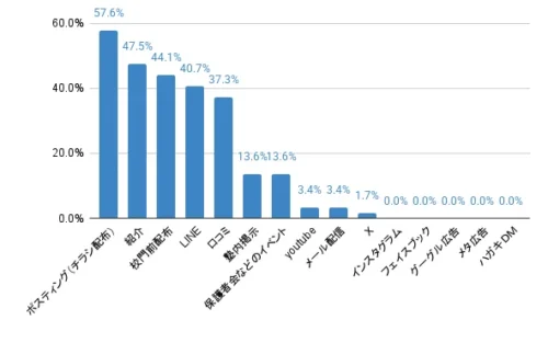 「現在特に力を入れている施策」は、1位 ポスティング(57.6%)、2位 紹介(47.5%)、3位 校門前配布(44.1%)で、オフライン施策が中心。